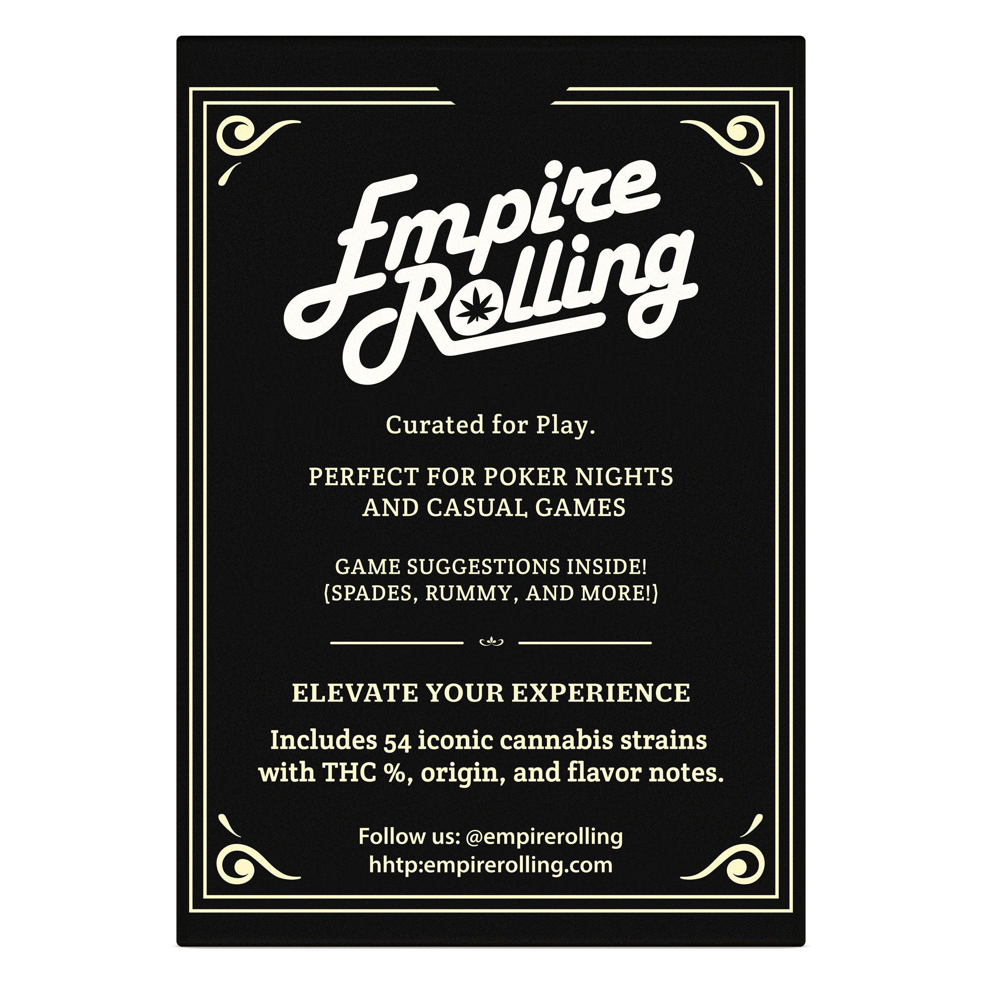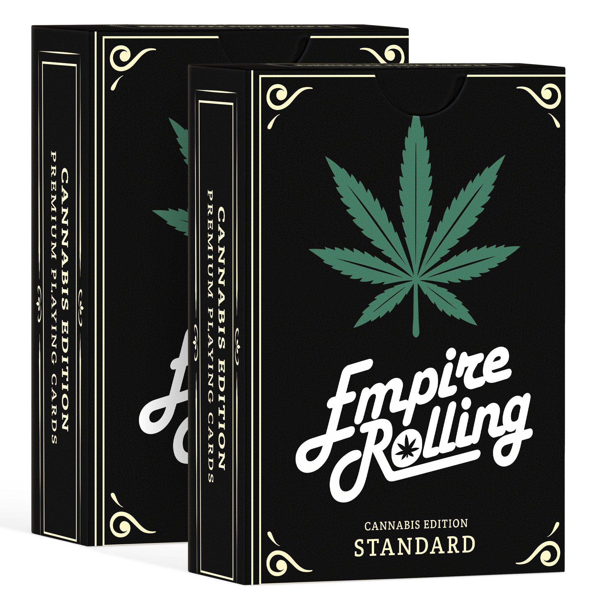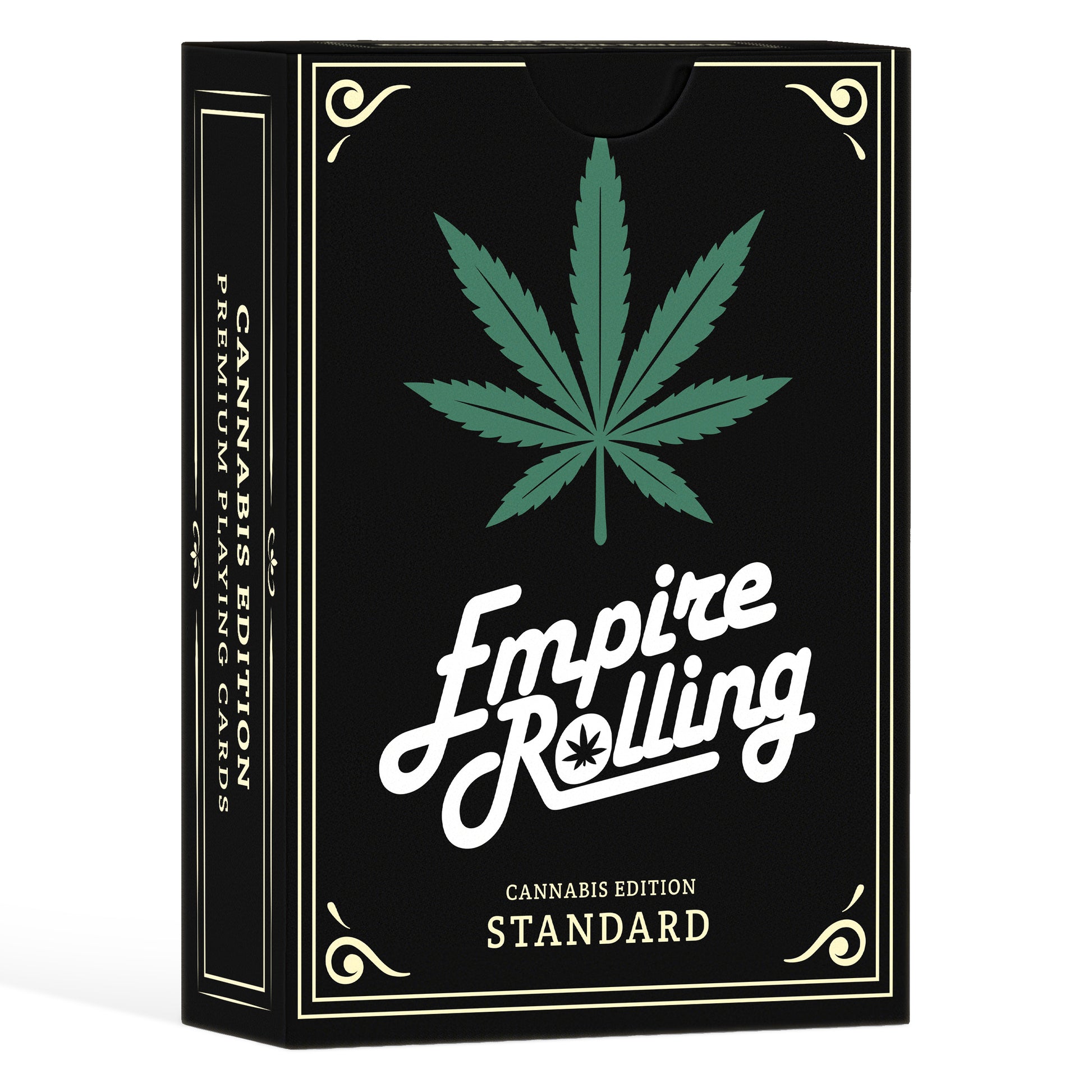 Each deck comes in a sleek black box featuring the iconic green cannabis leaf and bold Empire Rolling logo. The cards are made with premium stock for smooth handling and durability—perfect for poker nights, card games, or as a standout collector’s item.