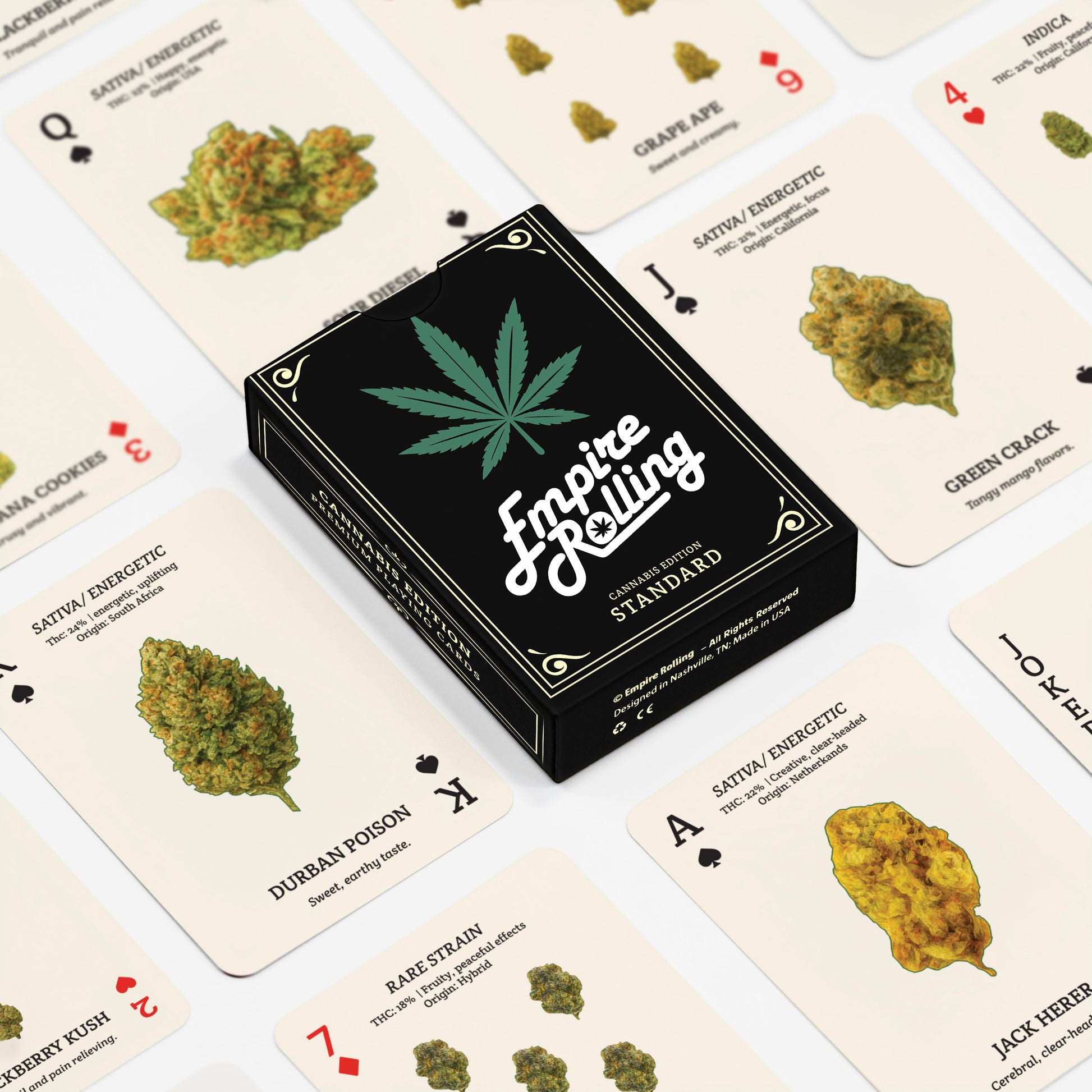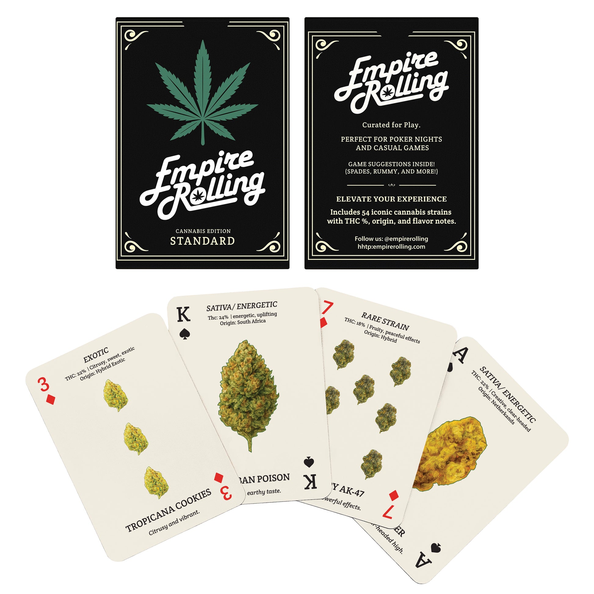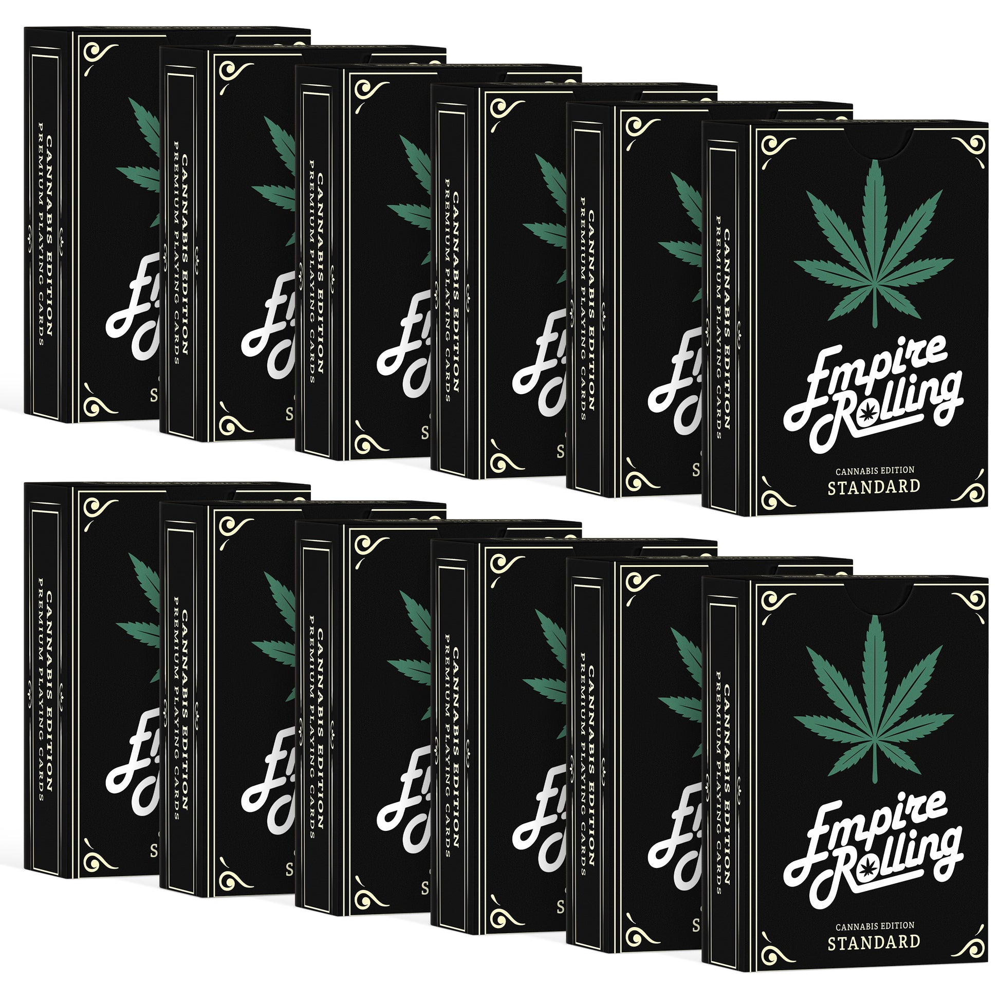 Each deck comes in a sleek black box featuring the iconic green cannabis leaf and bold Empire Rolling logo. The cards are made with premium stock for smooth handling and durability—perfect for poker nights, card games, or as a standout collector’s item.