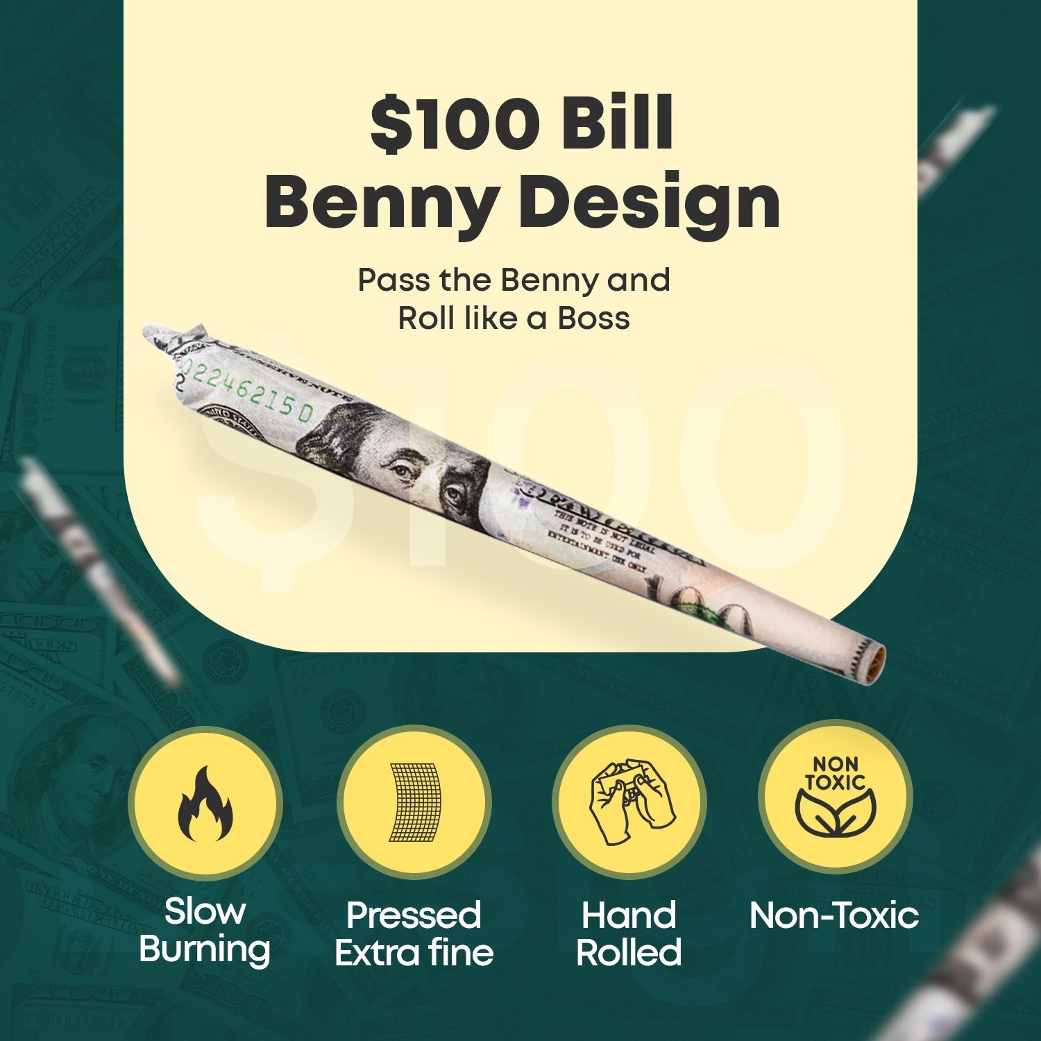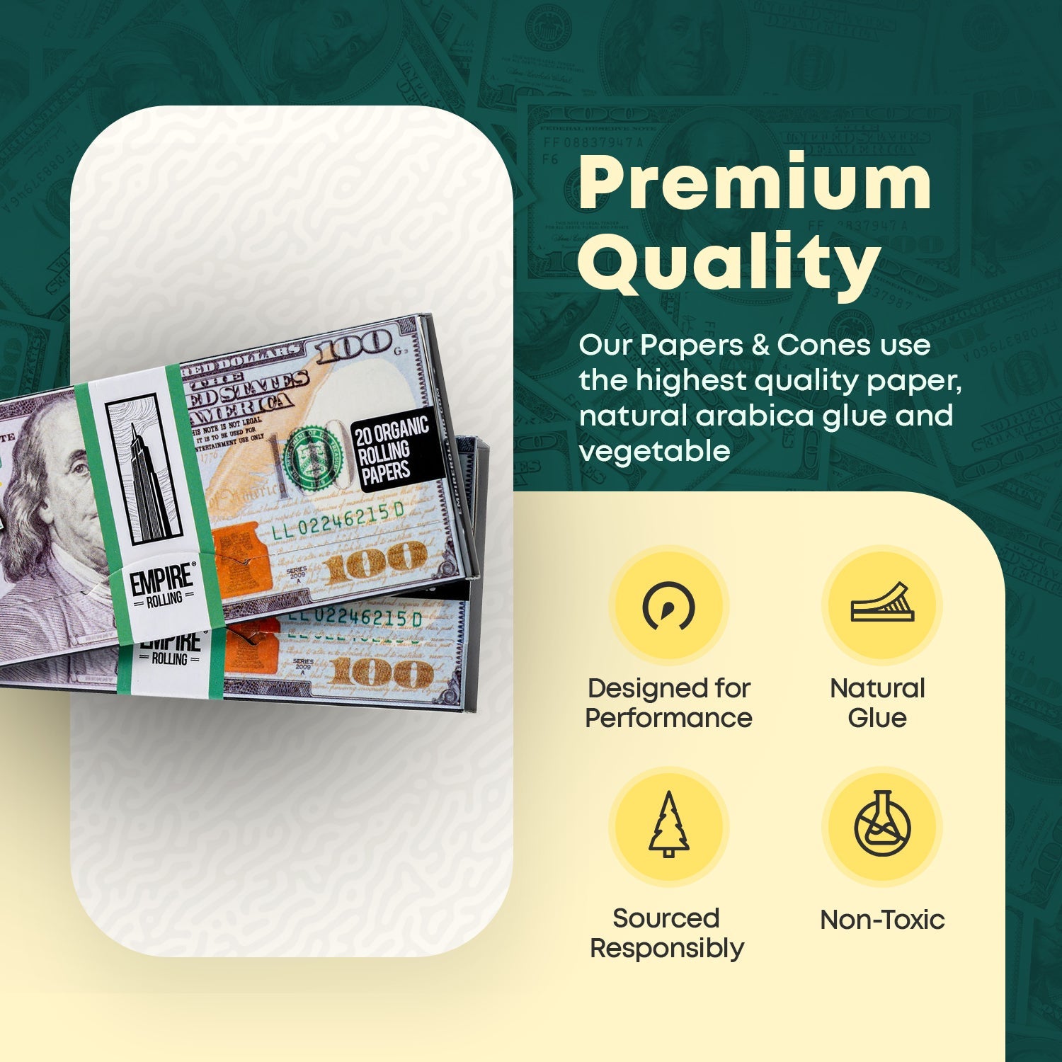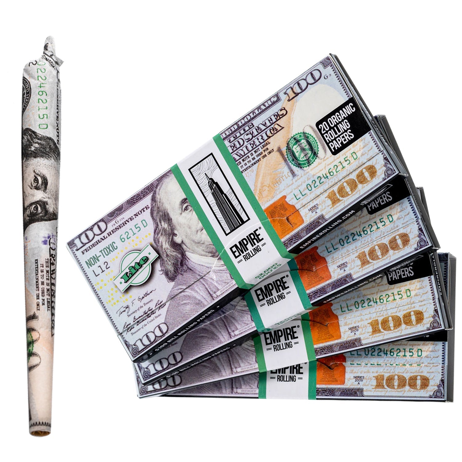 Crafted from premium, lab-tested wood pulp and completely free from bleach and harsh chemicals, each 4-pack includes Empire Rolling’s most effortless and easy-to-roll $100 bill papers.