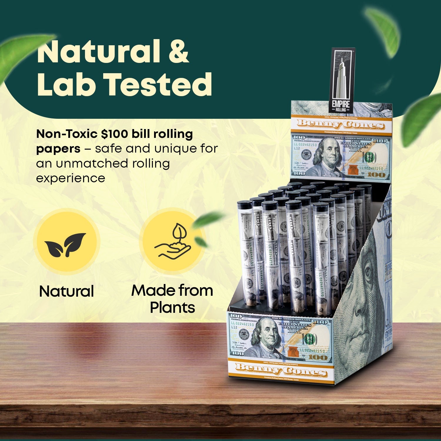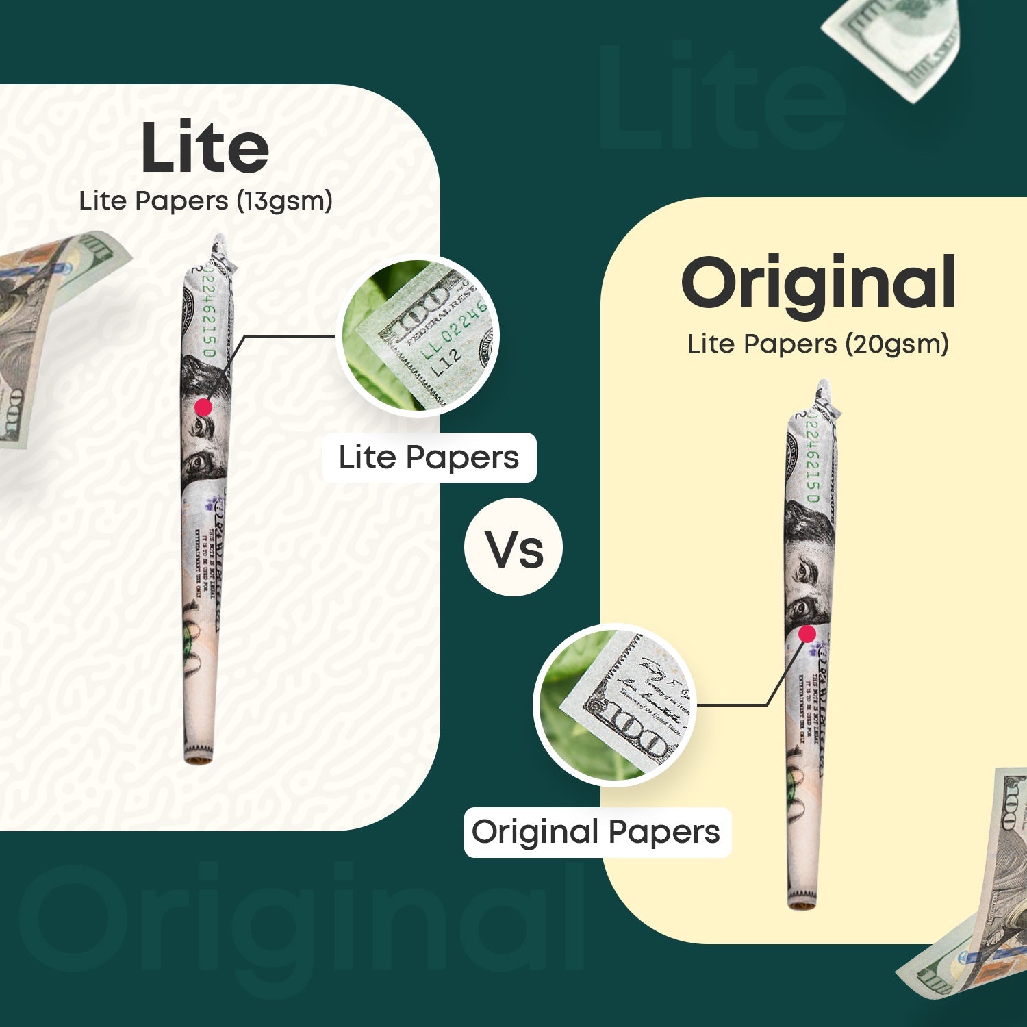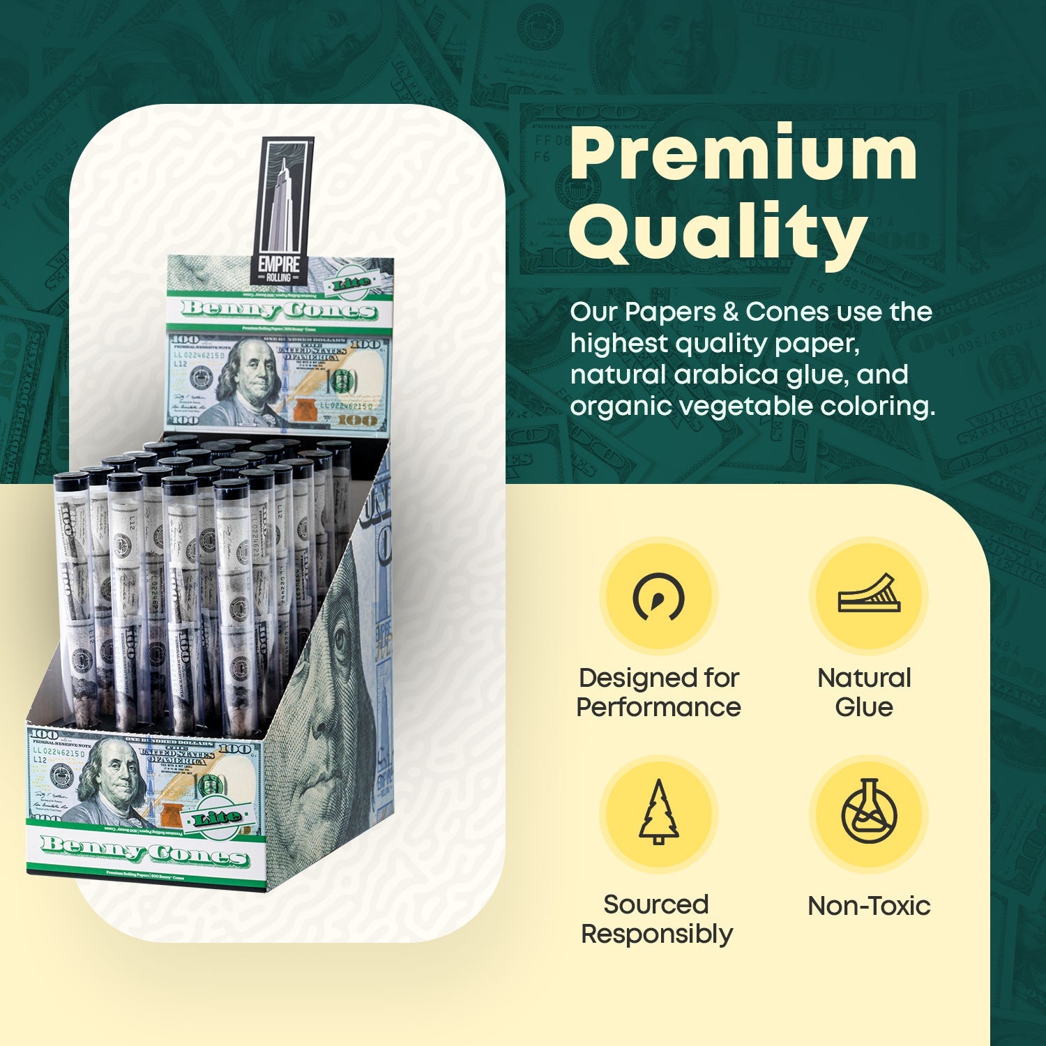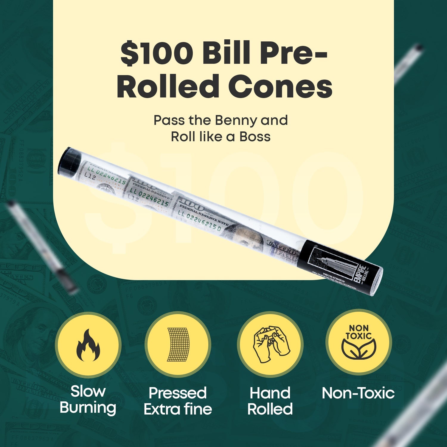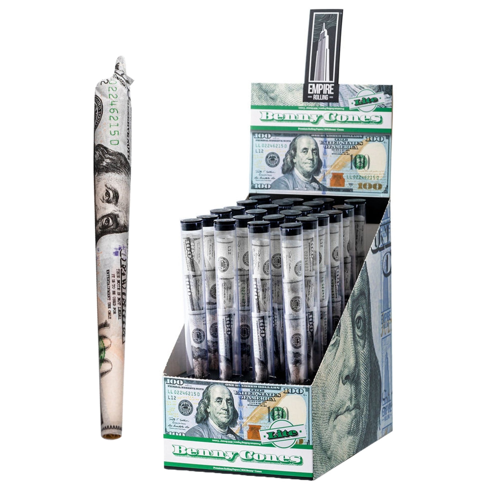 BENNY LITE Cones bring the $100 bill flex in a lighter, faster-burning format. Made from ultra-thin wood pulp paper, these pre-rolled cones are ideal for those who want the iconic Empire Rolling style with a quicker, cleaner smoke.
